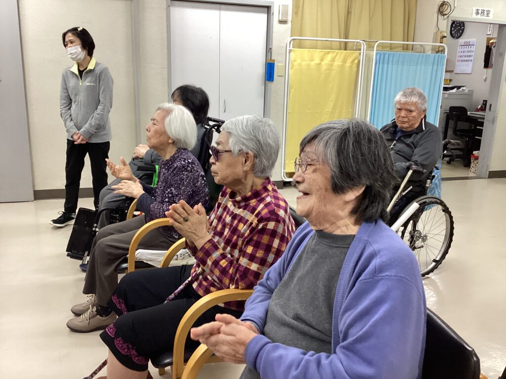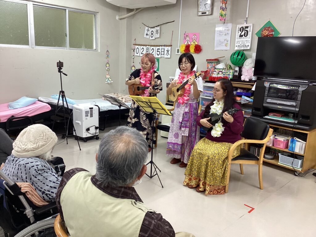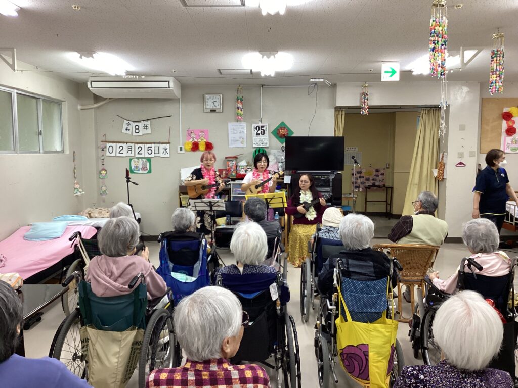 ウクレレ演奏 2026年3月12日 最終更新日時 : 2026年3月12日 majikina02 利用者さんのお孫さんが仲間と一緒にウクレレ演奏に来てくれました。生で聞く機会の少ないウクレレの音色に皆さん酔いしれ、一緒に歌ったり踊ったりと楽しい時間を過ごせました。ありがとうございました!