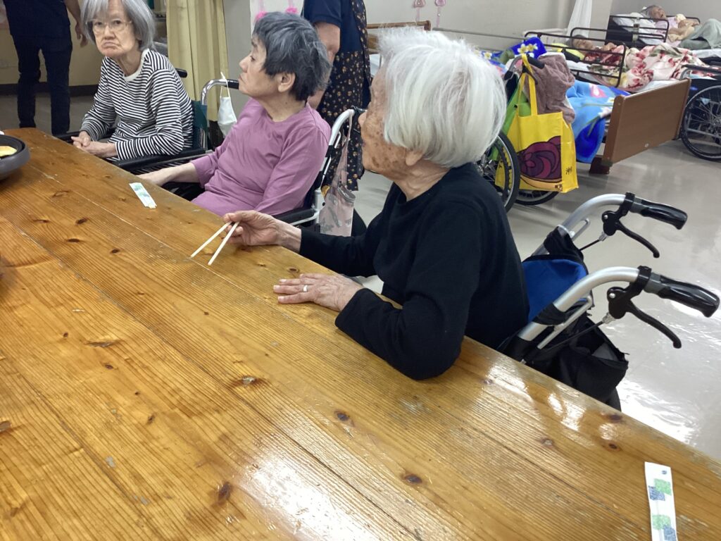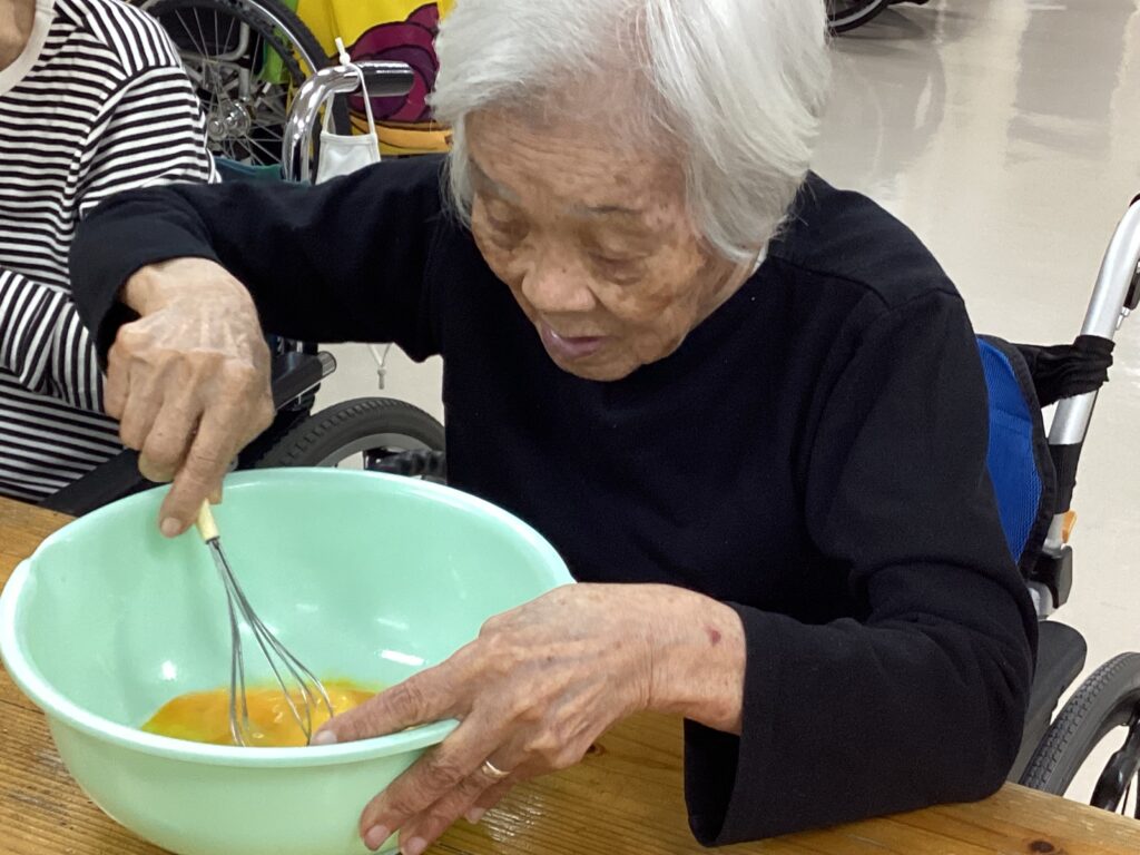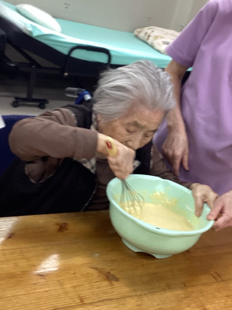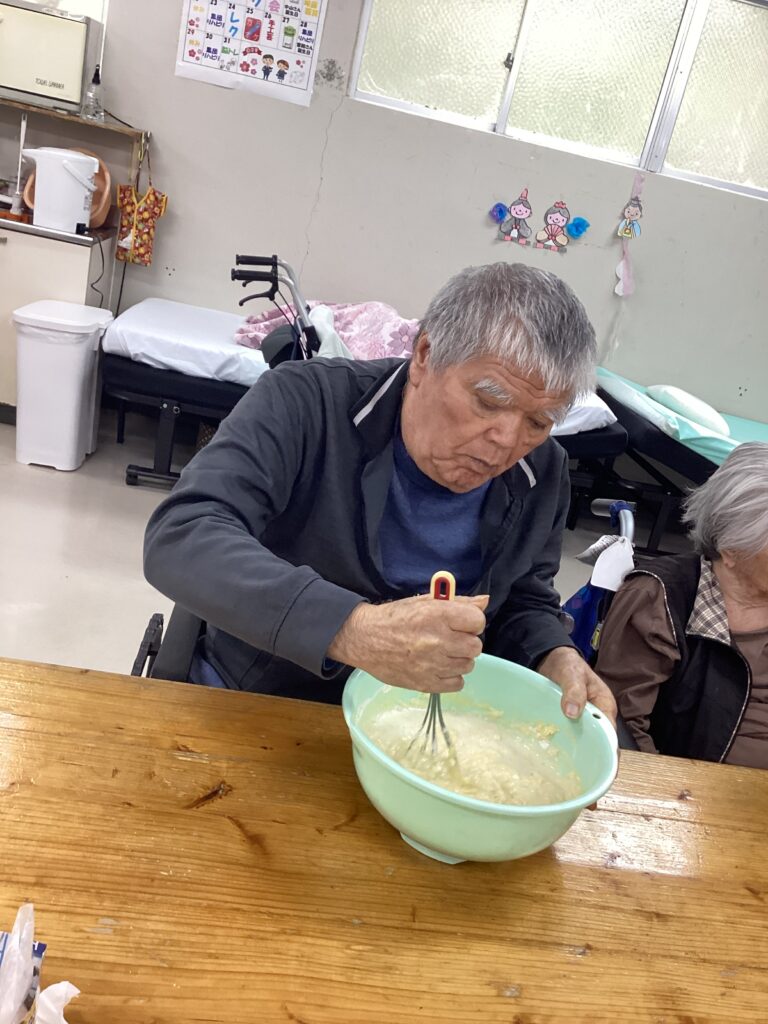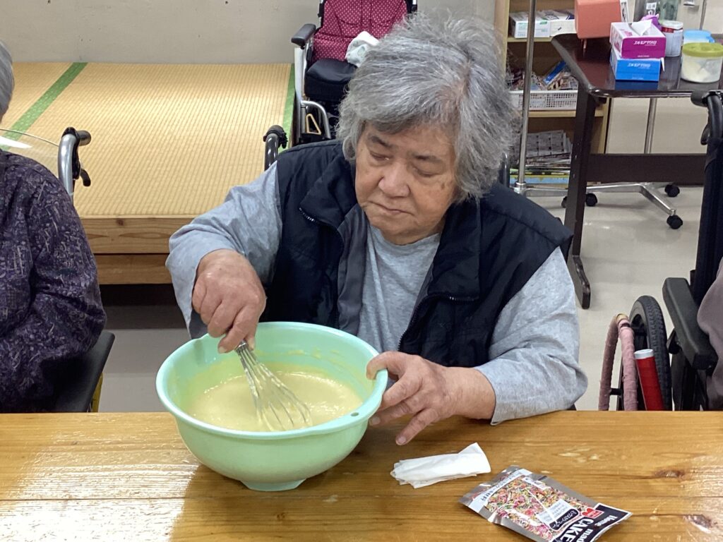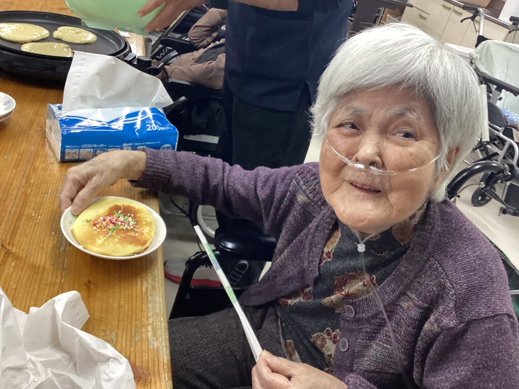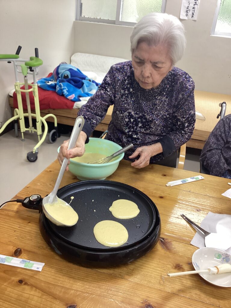 デイサービスかすりでは、毎年ひな祭りにホットケーキを作ってもらっています(理由は不明ですが、気付けば毎年恒例になっています)今年もホットケーキ作りを頑張って頂きました。食いしん坊のKさんは最初は見ているだけでしたが「自分の分は自分で作ってください」という声掛けを聞き、「1番大きいのを作ろ!」と張り切って作ってました。出来上がりが近づくと部屋中に美味しそう香りが漂い待ちきれないAさんはお箸を持ち、ホットプレートに車椅子でじりじりと近づいていました。