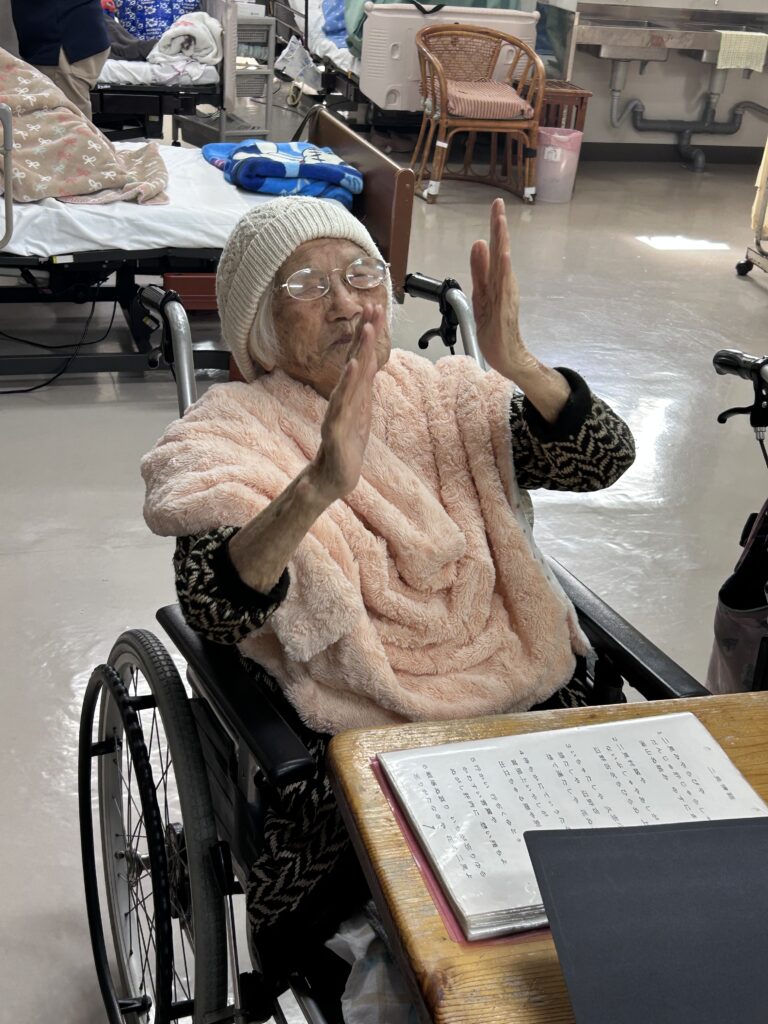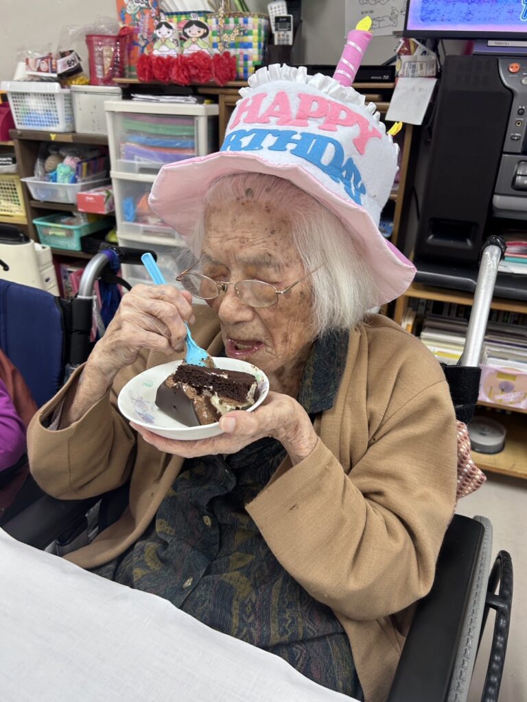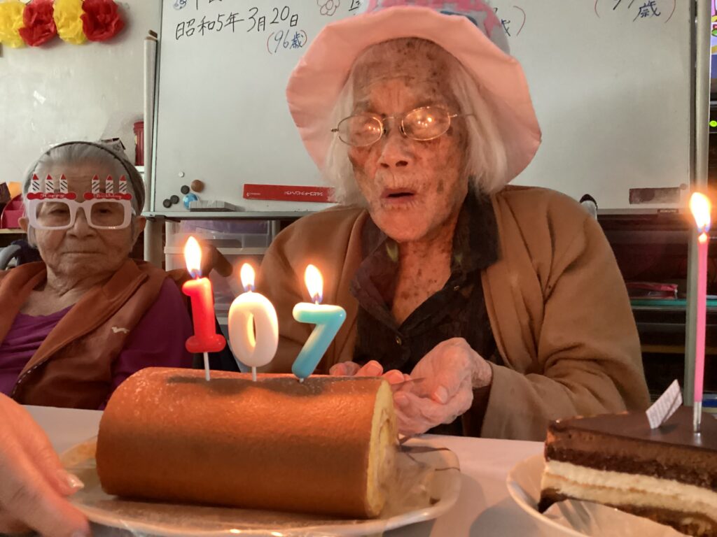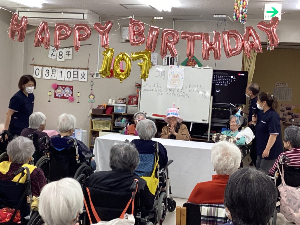 うちの最高齢の看板娘Oさんが3月10日に107歳を迎えました。最近は寝ている時間も増え、視力も大分落ちていますが、食事は自力でほぼ完食され(誕生日ケーキもペロリ)時々歌や踊りを披露してくれます。いつも穏やかで冗談の上手いOさん。今年も皆で一緒に誕生日をお祝いすることができて嬉しいです。