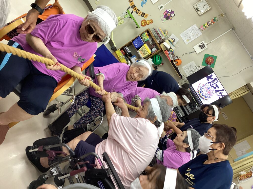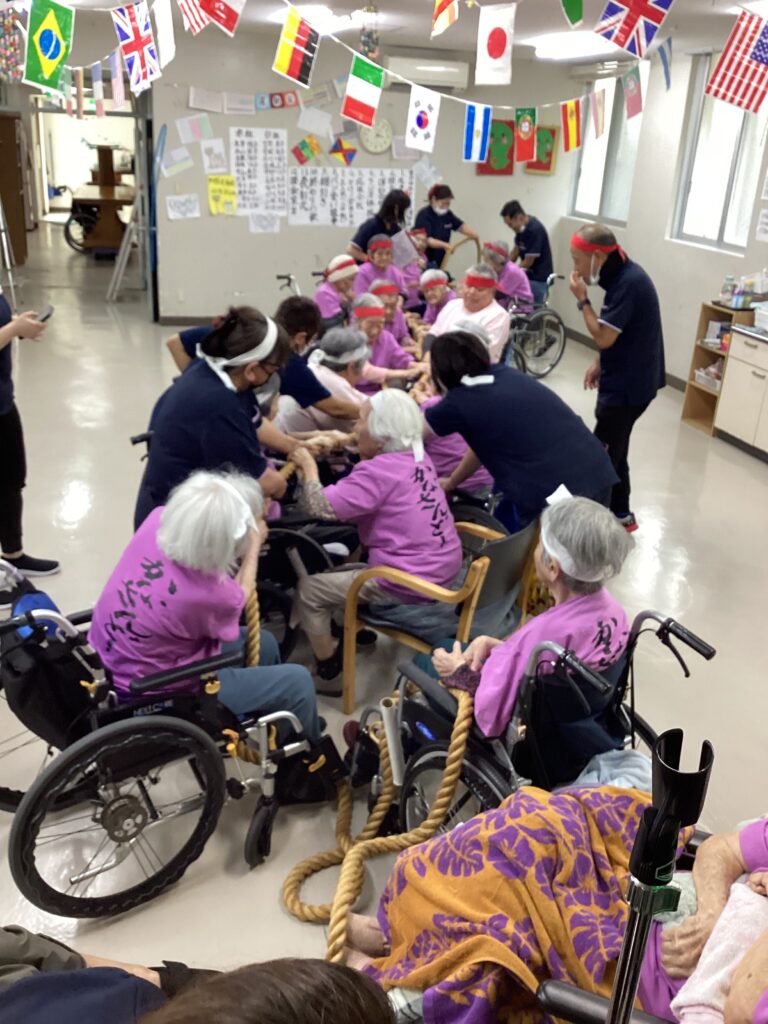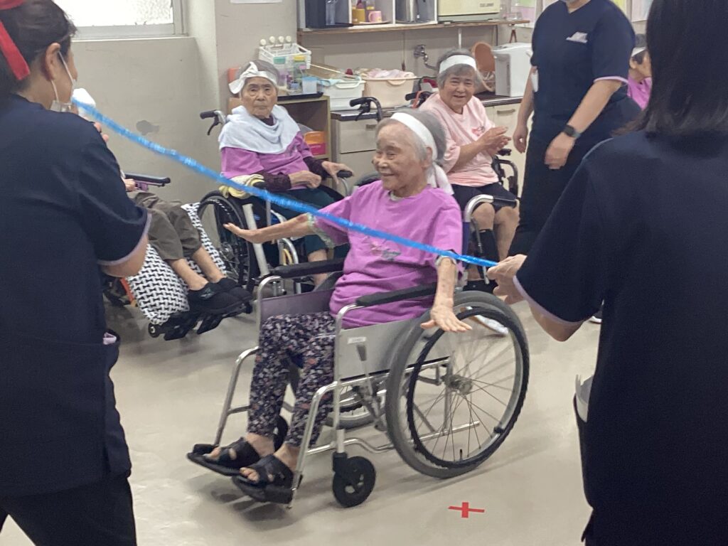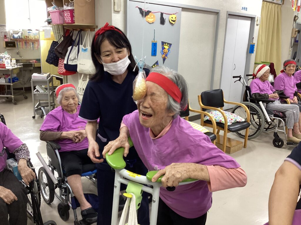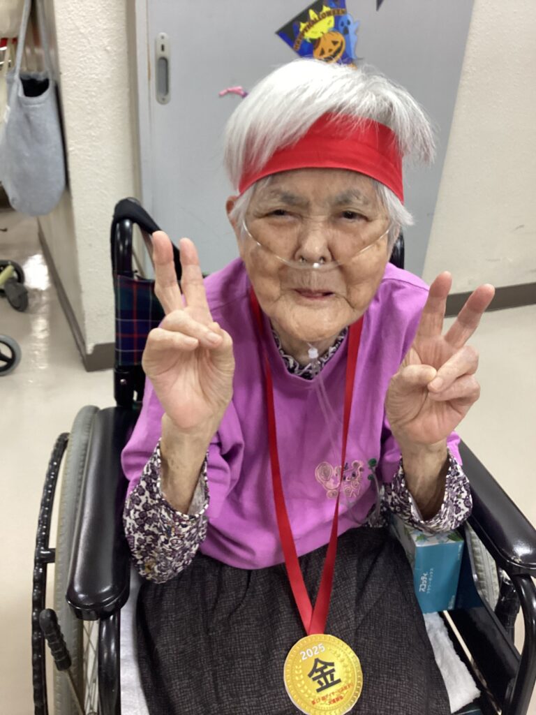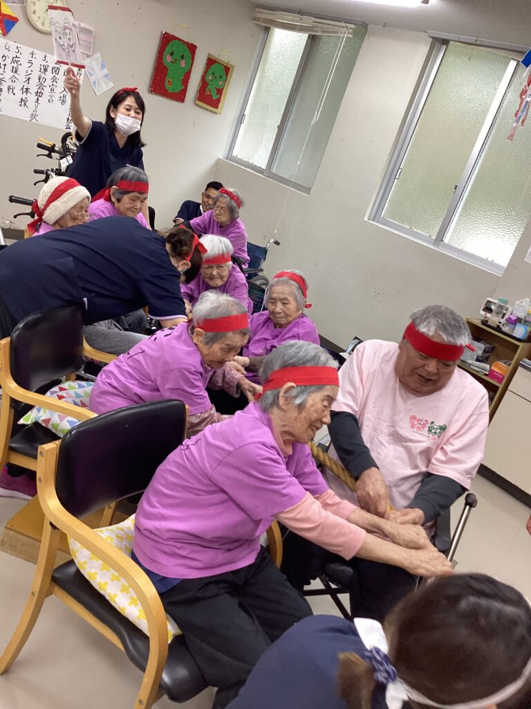 10月30日「2025かすり運動会」を行いました。昼食は厨房チーム特製の運動会弁当を食べ!気合を入れ!!入場行進からスタート!!!応援合戦・かけっこ(車いすレース)・玉入れ・パン食い競争・綱引きと今年も白熱した戦いが行われました。綱引きでは車いすが倒れそうな程、力が入り、抑える職員も必死でした。今年もケガなく無事に運動会行えました!