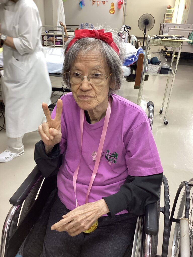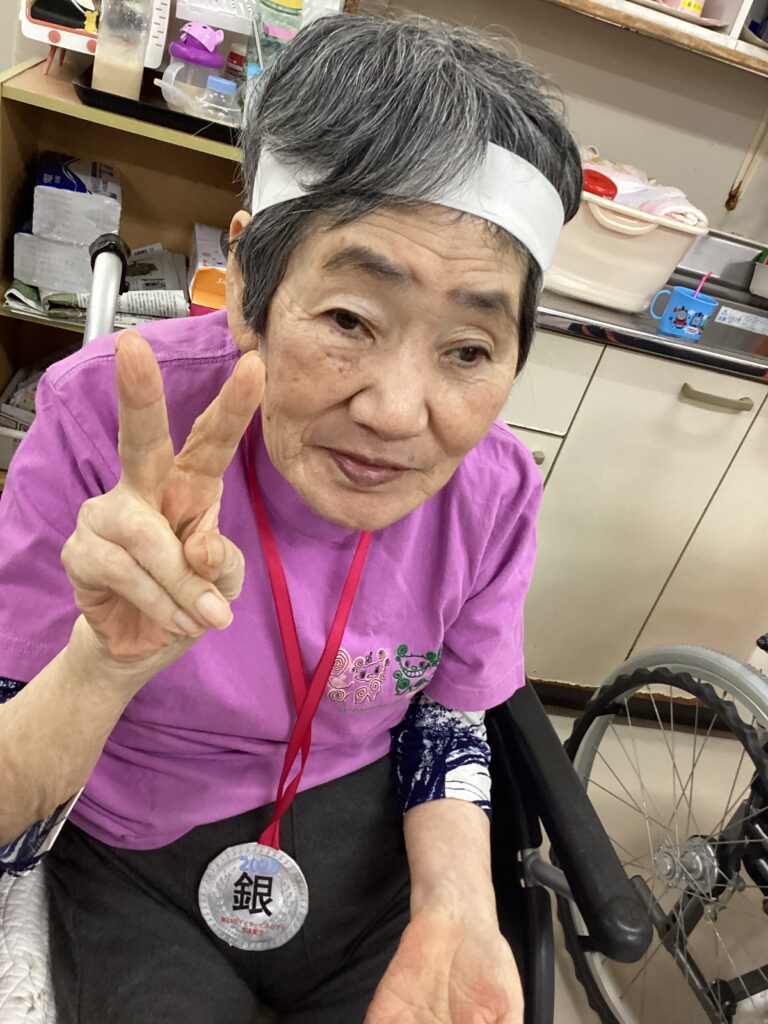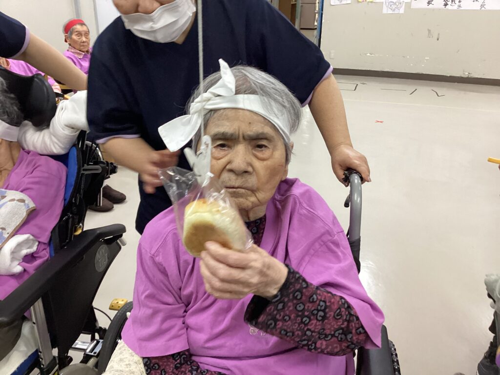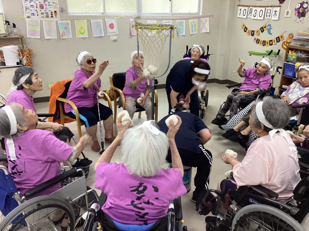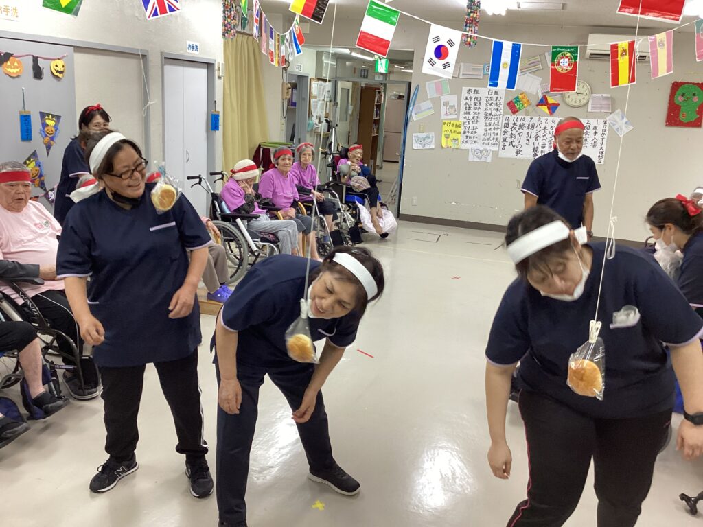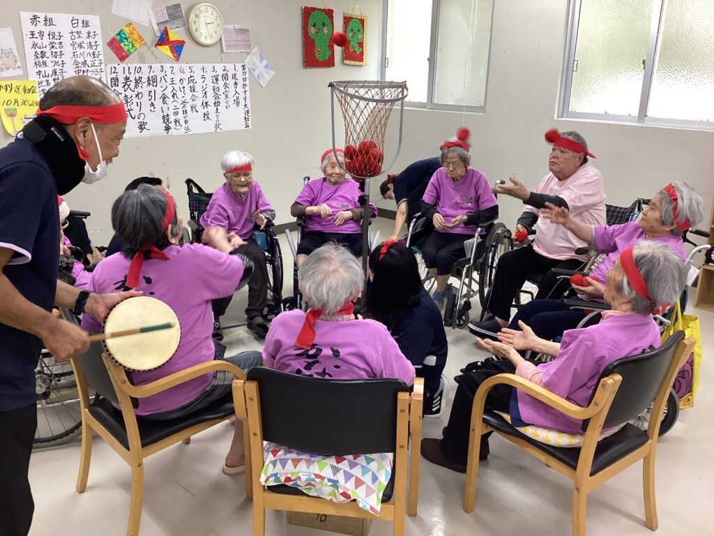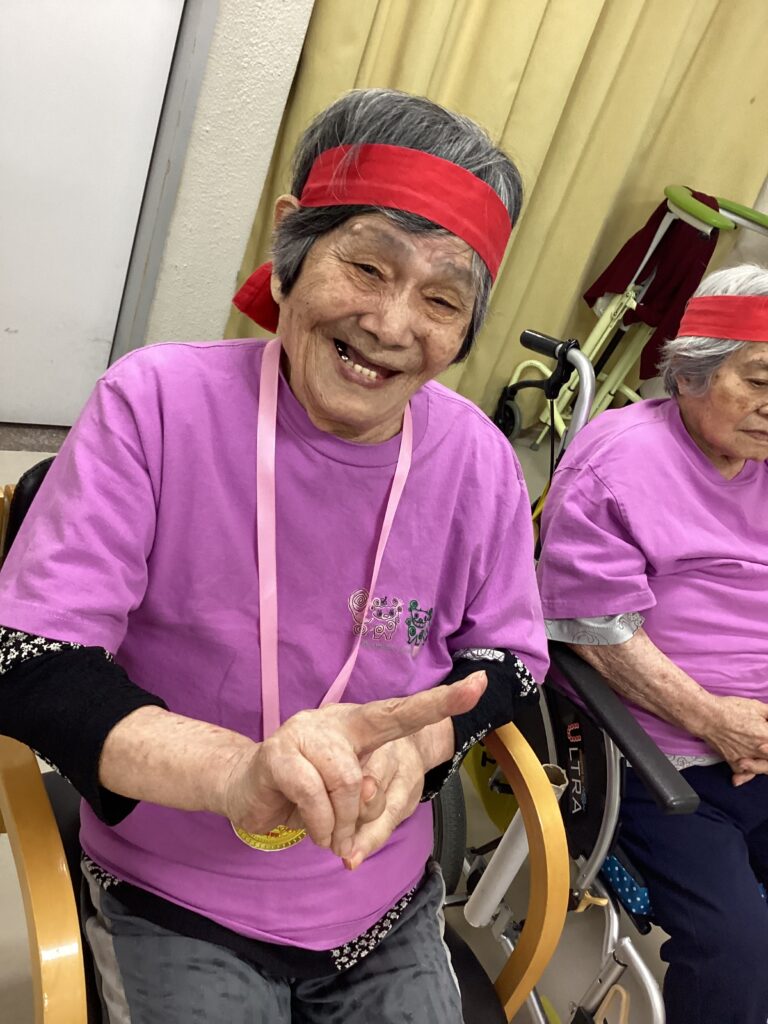 10月30日「2025かすり運動会」を行いました。昼食は厨房チーム特製の運動会弁当を食べ!気合を入れ!!入場行進からスタート!!!応援合戦・かけっこ(車いすレース)・玉入れ・パン食い競争・綱引きと今年も白熱した戦いが行われました。綱引きでは車いすが倒れそうな程、力が入り、抑える職員も必死でした。今年もケガなく無事に運動会行えました!