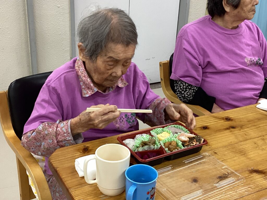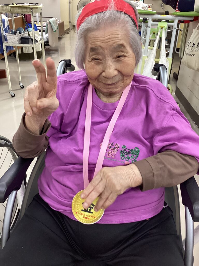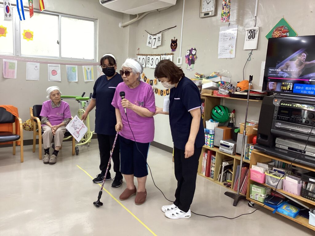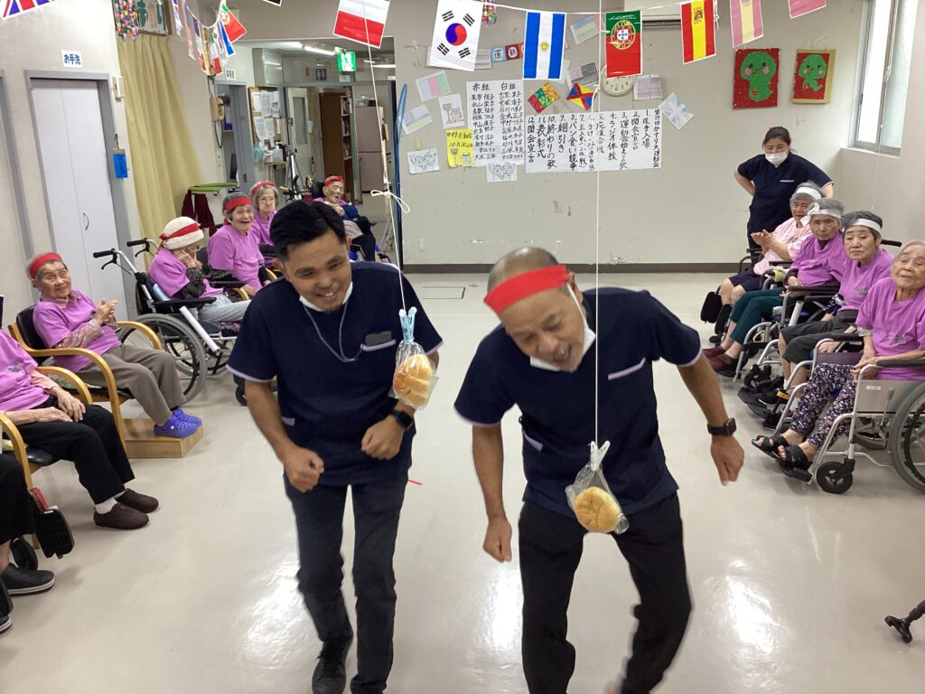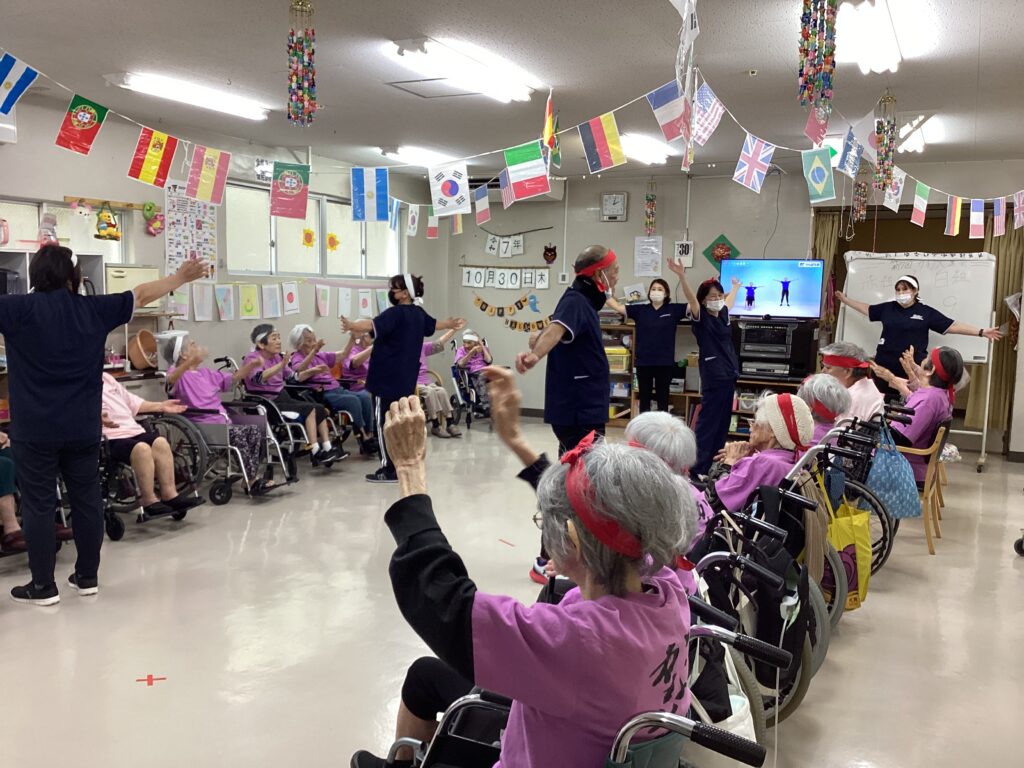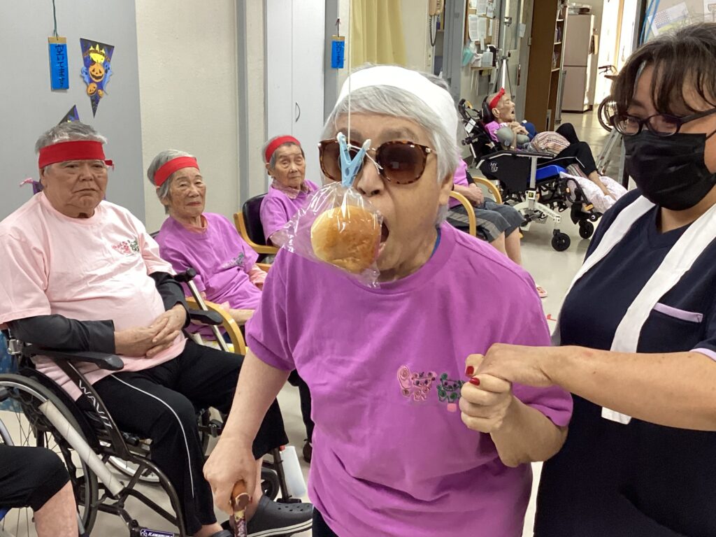 10月30日「2025かすり運動会」を行いました。昼食は厨房チーム特製の運動会弁当を食べ!気合を入れ!!入場行進からスタート!!!応援合戦・かけっこ(車いすレース)・玉入れ・パン食い競争・綱引きと今年も白熱した戦いが行われました。綱引きでは車いすが倒れそうな程、力が入り、抑える職員も必死でした。今年もケガなく無事に運動会行えました!